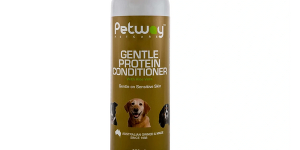 GENTLE PROTEIN CONDITIONER with Aloe Vera a naturally based, nourishing and revitalizing skin and coat conditioner. Natural Proteins and Aloe Vera soften and moisturize the skin and revitalize the coat appearance. It adds shine to the coat and promotes lustre. Leaves a low allergen tropical coconut fragrance.